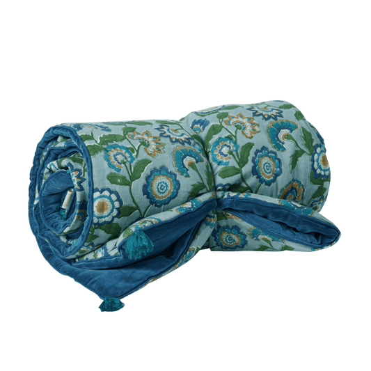 Copertura per divano o per letto in velluto e fiori stampati "a blocchi" - modello Guapao blu - dim. 200 x 90 cm