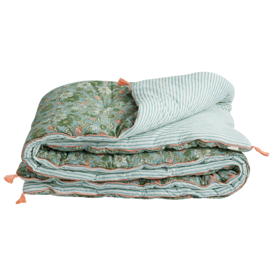 Copertura per divano o per letto in tessuto a strisce e fiori stampati "a blocchi" - modello Meera blu verde - dim. 200x90 cm