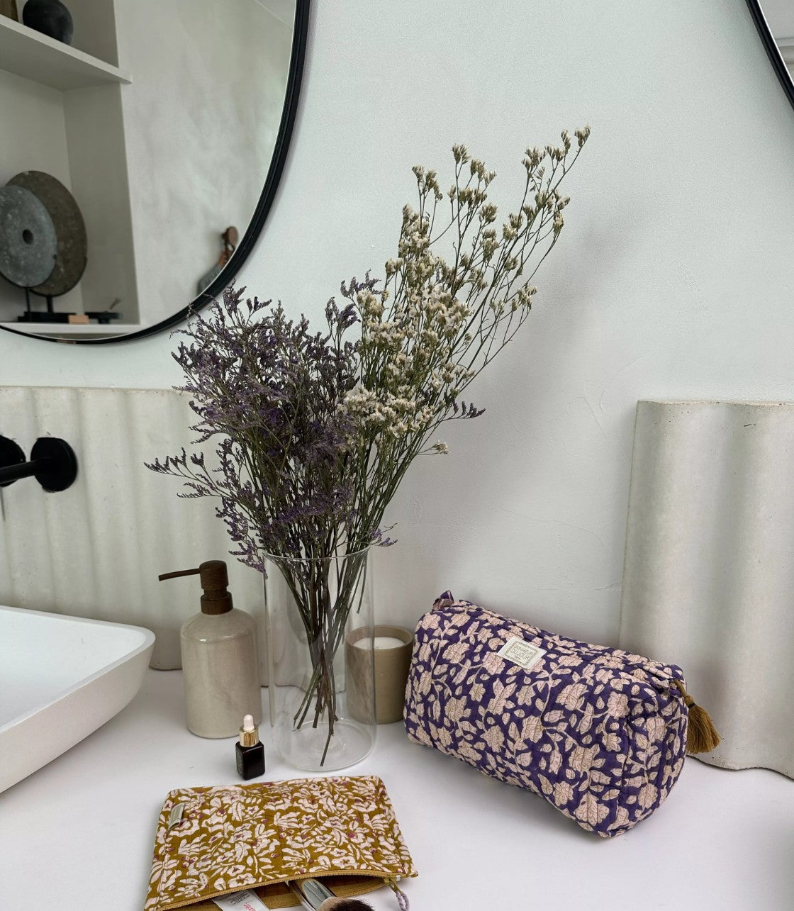 Realizzato in morbido cotone trapuntato, presenta una delicata stampa floreale dai colori luminosi che infondono allegria e freschezza ad ogni sguardo. Le cuciture verticali ne esaltano la texture soffice, mentre la nappina realizzata a mano aggiunge un tocco di autenticità e calore. L’apertura con zip rivela un interno pratico e spazioso, perfetto per custodire con stile i tuoi essenziali di viaggio o di ogni giorno. Un piccolo accessorio che unisce bellezza, funzionalità e poesia tessile.