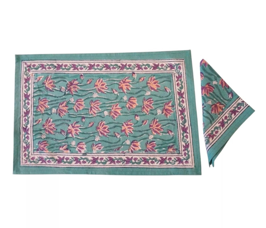 Questo set composto da tovaglietta ed il suo tovagliolo abbinato sono stati stampati a mano in India con la tecnica del blocco di legno, un sapere antico in cui ogni gesto umano è protagonista.