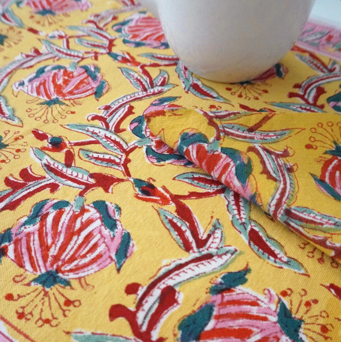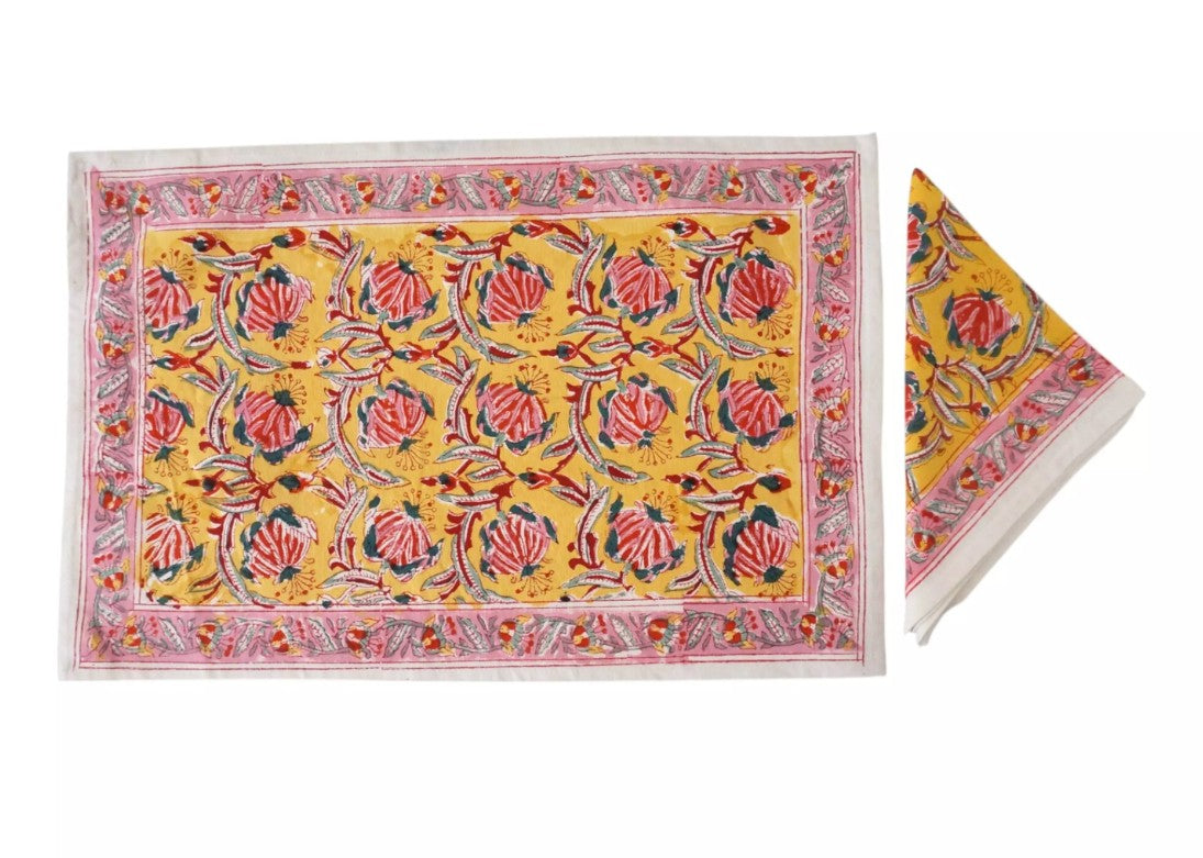 Questo set composto da tovaglietta ed il suo tovagliolo abbinato sono stati stampati a mano in India con la tecnica del blocco di legno, un sapere antico in cui ogni gesto umano è protagonista.