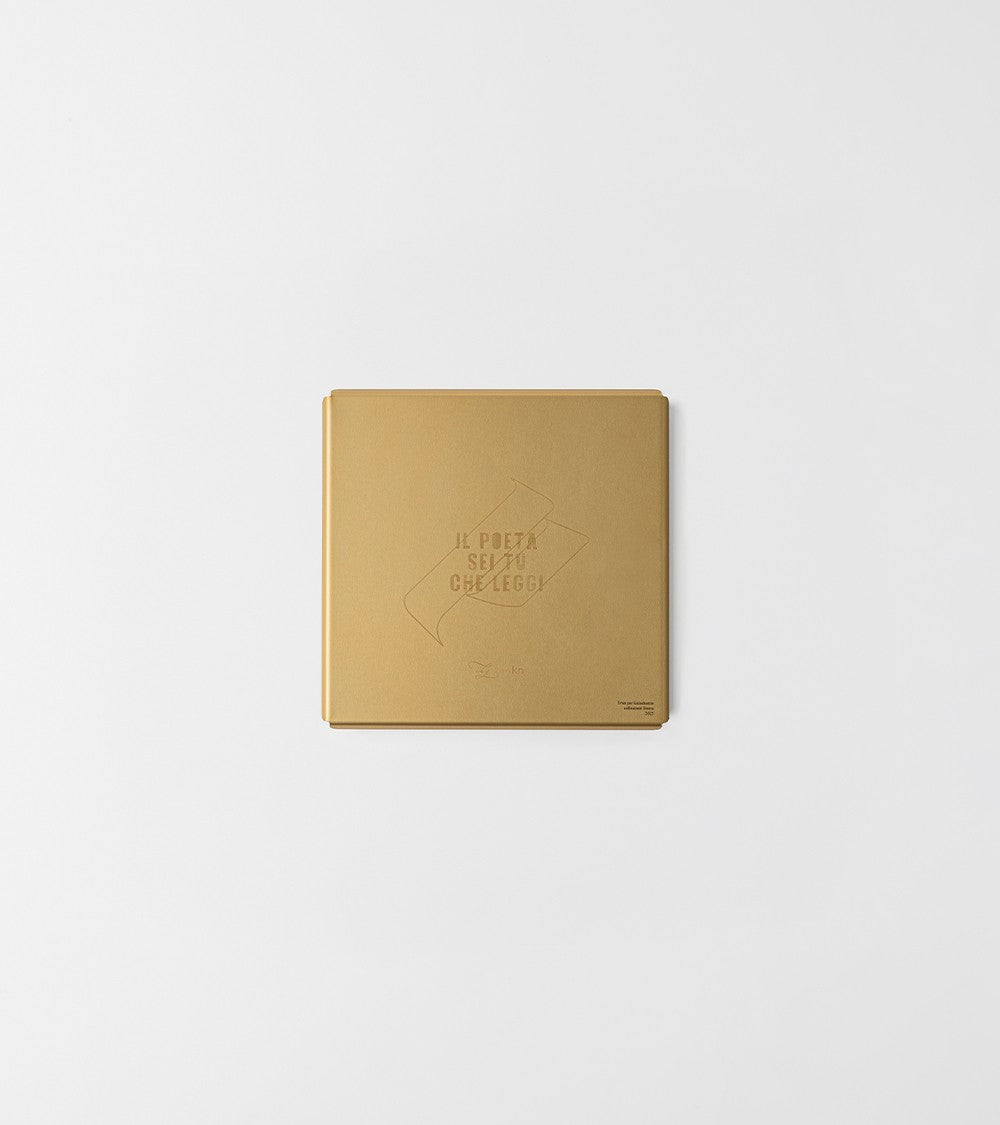 Impilabile con gli altri vassoi della collezione (50x20 e 40x20) per ottimizzare lo spazio, unisce forma essenziale e materiali puri. Il progetto rivela la sua anima più profonda solo quando l'oggetto viene rovesciato e si legge sul suo fondo: lì si cela una "scaglia" del poeta visivo Ivan, frammento che invita a un dialogo silenzioso e personale con chi lo utilizza.